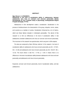 Adolescence in their development needs a socialization. Socialization is the process of individual learns the characteristic of the group, etiquette, norms, values, and customs as a member of society. Socialization influenced by a lot of factors, which are those factors included in individual’s personality. The aimed of this research is to find out differences in the level of socialization ability in late adolescence, between adolescents who have an extrovert and introvert personality. The instrument of this research are questionaires, which are given to 200 subjects. The data are analyzed by Mann Whitney method. In this research, the level of socialization ability for adolescents who have extrovert personality are (M = 147,001, SD = 12,49) and adolescents who have introvert personality are (M= 146,547, SD = 12,16). The result shows U (82,118) = 4.742, p > 0,05. It means there is no difference in the level of socialization ability between adolescents who have extrovert personality and adolescents who have introvert personality.
