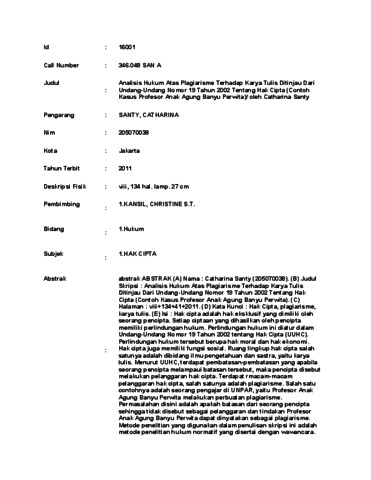 Cathrina, Santy (2011) Analisis Hukum Atas Plagiarisme Terhadap Karya Tulis Ditinjau Dari Undang-Undang Nomor 19 Tahun 2002 Tentang Hak Cipta (Contoh Kasus Profesor Anak Agung Banyu Perwita). Skripsi thesis, Universitas Tarumanagara.