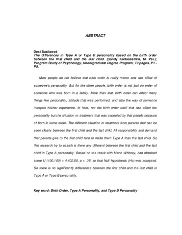 Most people do not believe that birth order is really matter and can effect of someone’s personality. But for the other people, birth order is not just an order of someone who was born in a family. More than that, birth order can effect many things like personality, attitude that was performed, and also the way of someone interpret his/her experience. In here, not the birth order itself that can effect the personality but the situation or treatment that was accepted by that people because of born in some order. The different situation or treatment from parents that can be seen clearly between the first child and the last child. All responsibility and demand that parents give to the first child tend to make them Type A than the last child. So this research try to search is there any different between the first child and the last child in Type A personality. Based on the result with Mann Whitney, had obtained score U (100,100) = 4,402.50, p > .05, so that Null Hypothesis (Ho) was accepted. So there is no significantly differences between the first child and the last child in Type A or Type B personality.