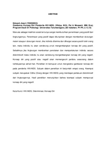 Jiwari, Edward (2009) Gambaran Konsep Diri Penderita HIV/AIDS. Skripsi thesis, Universitas Tarumanagara.