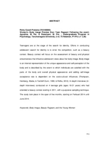 Teenagers are at the stage of the search for identity. Efforts in conducting adolescent search for identity is to enter the competition, such as a beauty contest. Beauty contest will focus on the assessment of beauty and physical attractiveness that influence adolescent views about her body image. Body image is an internal representation of the unique appearance and self-perception of the body and is described by the extent to which individuals are satisfied with the parts of the body and overall physical appearance and adding self-image acceptance rate is dependent on the socio-cultural influences (Thompson, Heinberg, Altabe, & Tantleff-Dunn, 1999; & Ridha, 2012). In-depth interviews (in-depth interviews) conducted on 4 teenage girls (ages 18-21 years) who had attended a beauty contest starting in 2011, with a purposive sampling technique. The study took place in the span of five months, starting on Ferbuari 2014 until June 2014.