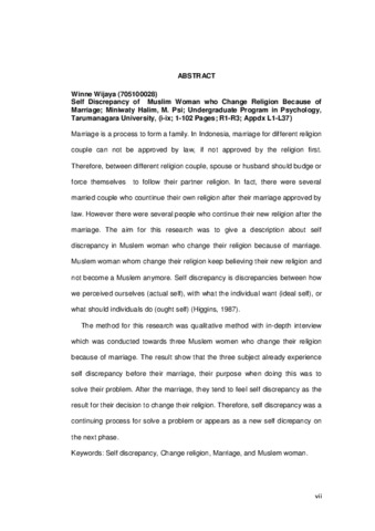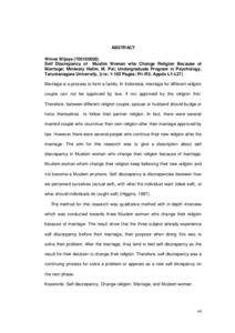 Marriage is a process to form a family. In Indonesia, marriage for different religion couple can not be approved by law, if not approved by the religion first. Therefore, between different religion couple, spouse or husband should budge or force themselves to follow their partner religion. In fact, there were several married couple who countinue their own religion after their marriage approved by law. However there were several people who continue their new religion after the marriage. The aim for this research was to give a description about self discrepancy in Muslem woman who change their religion because of marriage. Muslem woman whom change their religion keep believing their new religion and not become a Muslem anymore. Self discrepancy is discrepancies between how we perceived ourselves (actual self), with what the individual want (ideal self), or what should individuals do (ought self) (Higgins, 1987). The method for this research was qualitative method with in-depth interview which was conducted towards three Muslem women who change their religion because of marriage. The result show that the three subject already experience self discrepancy before their marriage, their purpose when doing this was to solve their problem. After the marriage, they tend to feel self discrepancy as the result for their decision to change their religion. Therefore, self discrepancy was a continuing process for solve a problem or appears as a new self dicrepancy on the next phase.