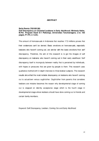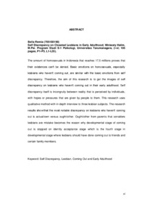 The amount of homosexuals in Indonesia that reaches 17,5 millions proves that their existences can’t be denied. Basic emotions on homosexuals, especially lesbians who haven’t coming out, are similar with the basic emotions from self discrepancy. Therefore, the aim of this research is to get the images of self discrepancy on lesbians who haven’t coming out in their early adulthood. Self discrepancy itself is incongruity between reality that is perceived by individuals, with hopes or pressures that are given by people to them. This research uses qualitative method with in-depth interview to three lesbian subjects. The research results show that the most notable discrepancy on lesbians who haven’t coming out is actual/own versus ought/other. Ought/other from parents that considers lesbians are mistake becomes the reason why developmental stage of coming out is stopped on identity acceptance stage which is the fourth stage in developmental stage where lesbians should have done coming out to friends and certain family members.