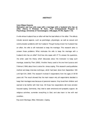 A wife whose husband has an affair will feel the bad effects of the affair. The affects include several aspects, such as psichologic, physiologic, as well as sexual and communication problems with her husband. Though having known her husband has an affair, the wife is still motivated to keep the marriage. This research aims to answer these problems: What motivates the wife to keep the marriage with a husband who has an affair? And how she copes with it? To answer the questions, the writer used the theory which discusses about the motivaton to keep such marriage, stated by Then (2002). Another theory used is the one from Lazarus and Folkman (1984) about how to solve the stress coping. This research used qualitative method and deep interview technique, which had been done from September 18th until April 3th, 2008. The research involved 5 respondents from the ages of 30-50 years old. The result showed that the main reason why all respondents decided to keep their marriages was because of personal reasons: they loved their children and wanted to be faithful with their love. All those five respondents did more emotion focused coping. Commonly, they tried to seek emotional and sympathy support, do religious activities, surrender everything to God, and also learn to live with real condition.