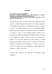 This study was conducted to determine the role of parent attachment and peer attachment on middle adolescence life satisfaction. The number of respondents who participated in this study were 391 middle adolescents, aged 14-17 years old in Jakarta. The sampling technique that used is non-probability sampling technique, convenience sampling. For the measure instruments, this study used the Inventory of Parent and Peer Attachment-Revised (IPPA-R) and the Multidimensional Students' Life Satisfaction Scale (MSLSS). Based on the results of linear regression test, F(388) = 212,378, p = 0,000 <0,01 so that there is a significant role from parent attachment and peer attachment in middle adolescence life satisfaction. Moreover, there is a significant role from parent attachment in middle adolescence life satisfaction (t = 14.999, p = 0.000 <0.01) and there is a significant role from peer attachment in middle adolescence life satisfaction (t = 8.849, p = 0.000 <0.01).