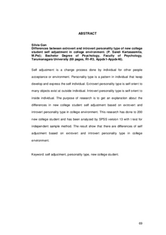 Gan, Silvia (2008) Perbedaan Antara Penyesuaian Diri Mahasiswa Baru Yang Memiliki Tipe Kepribadian Ektrovert Dan Introvert Dalam Lingkungan Perkuliahan. Skripsi thesis, Universitas Tarumanagara.
