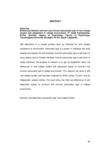 Self adjustment is a change process done by individual for other people acceptance or environment. Personality type is a pattern in individual that keep develop and express the self individual. Extrovert personality type is self orient to many objects exist at outside individual. Introvert personality type is self orient to inside individual. The purpose of research is to get an explanation about the differences in new college student self adjustment based on extrovert and introvert personality type in college environment. This research has done to 200 new college student and has been analyzed by SPSS version 13 with t-test for independent sample method. The result show that there are differences of self adjustment based on extrovert and introvert personality type in college environment.
