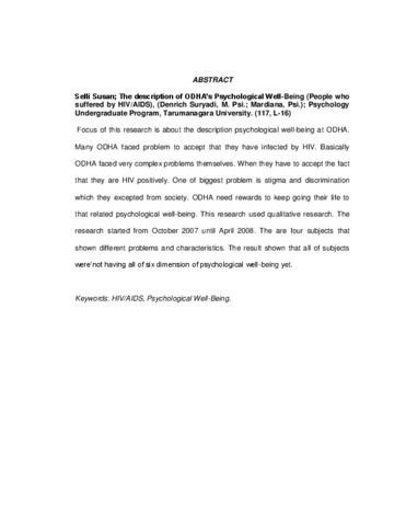 Susan, Selli (2008) Gambaran Kesejahteraan Psikologis Pada ODHA (Orang Dengan HIV/AIDS). Skripsi thesis, Universitas Tarumanagara.