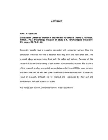 Febriani, Marta (2008) Self Esteem Perempuan Lajang Paruh Baya. Skripsi thesis, Universitas Tarumanagara.