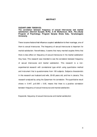 There is some factors that influence couples’ satisfaction to their marriage, one of them is sexual intercourse. The frequency of sexual intercourse is important for marital satisfaction. Nevertheless, it seems that many married couples thinks that there is less effect on frequency of sexual intercourse in the marital satisfaction they have. This research was intended to see the correlation between frequency of sexual intercourse and marital satisfaction. This research is a non-experimental research with correlational type which using quantitative method and instrument that is questionnaires from 100 subjects. Subjects characteristic in this research are husband and wife, 20-65 years old, and live in Jakarta. This research analyzed by using the Spearman rho correlation. The quantitative result shows r= 0.447, p=0.000 < 0.05, means that there is a positive correlation between frequency of sexual intercourse and marital satisfaction.