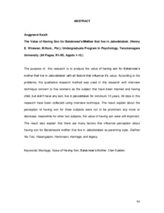 The purpose of this research is to analyze the value of having son for Bataknese’s mother that live in Jabodetabek with all factors that influence it’s value. According to the problems, the qualitative research method was used in this research with interview technique concern to five womans as the subject that have been married and having child, but didn’t have any son, live in jabodetabek for minimum 10 years. All data in this research have been collected using interview technique. The result explain about the perception of having son for three subjects were not to be prominent any more or decrease, meanwhile for other two subjects, the value of having son were still important. The result also explain that there are many factors that influence perception about having son for Bataknese’s mother that live in Jabodetabek as parenting style, Dalihan Na Tolu, Hasangapon, Hamoraan, marriage, and legacy.
