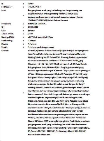 (A) Nama : Debora Purnami (B) Judul Skripsi : Pengangkatan Anak Yang Berbeda Agama Dengan Orang Tua Angkat Menurut Undang?Undang No. 23 Tahun 2002 Tentang Perlindungan Anak ( Contoh Kasus : Penetapan Nomor : 106/PDT-P/2009/PNCJ) (C) Halaman : viii + 75 + 27 + 2010 Perlindungan Anak (D) Kata Kunci : Pengangkatan Anak, Hukum (E) Isi : Pengangkatan anak yang berbeda agama telah terjadi di daerah Cianjur yaitu antara pasangan AY dan HK dengan pasangan HS dan U. Pasangan AY dan HK yang beragama Kristen mengangkat anak dari pasangan HS dan U yang beragama Islam. Apakah penetapan pengangkatan anak yang dilakukan pasangan AY dan HK sudah sesuai dengan Undang ? Undang Nomor 23 Tahun 2002 Tentang Perlindungan Anak? Penulis meneliti masalah tersebut dengan menggunakan metode penelitian hukum normatif, ditambah dengan dilakukannya wawancara dengan Hakim Pengadilan Negeri Cianjur, Komisi Perlindungan Anak Indonesia, Pengacara dari BJM Law Firm, serta Petugas Suku Dinas Kependudukan dan Pencatatan Sipil DKI Jakarta. Data penelitian memperlihatkan adanya ketidaksesuaian dalam pengangkatan anak tersebut. Kesimpulan dari penulis adalah bahwa telah terjadi ketidaksesuaian atau bertentangan dengan beberapa pasal dalam Undang ? Undang Perlindungan Anak dan Peraturan Pemerintah Nomor 54 Tahun 2007 tentang Pengangkatan Anak. Maka sebaiknya pengangkatan anak yang berbeda agama tidak dilakukan karena tidak sesuai dengan peraturan perundang ? undangan yang berlaku. (F) Acuan : 26 (1981 - 2008) (G) Pembimbing : Mulati, S.H., M.H. (H) Penulis Debora Purnami