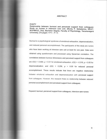 Burnout is a psychological syndrome of emotional exhaustion. depersonalization, and reduced personal accomplishment. The participants of this study are nurses who have been working at intensive care unit at least for one year. Data were obtained using questionnaire and processed using Spearman correlation. The correlation between burnout dimensions and perceived support from colleagues are r(32) = -0.484. p < 0.01 for emotional exhaustion; r(32) = -0.318, p < 0.05 for depersonalization; and r(32) = 0.256 , p > 0.05 for reduced personal accomplishment. These results indicate that there are negative relationship between emotional exhaustion and depersonalization with perceived support from colleagues . However. this research finds no relationship between reduced personal accomplishment and perceived support from colleagues.