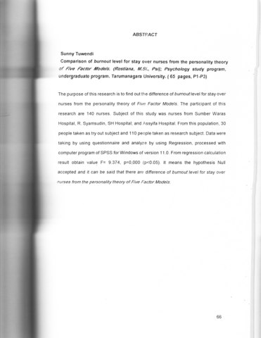 Tuwendi, Sunny (2006) Perbandingan Tingkat Burnout Di Antara Kepribadian Five Factor Models Pada Perawat Rawat Inap. Skripsi thesis, Universitas Tarumanagara.