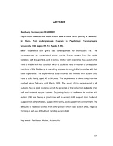 Pengalaman pahit yang menyakitkan dapat memberikan dampak negatif bagi individu yang mengalaminya. Hal tersebut berupa stres yang berat, lari dari kenyataan hidup, putus asa, isolasi sosial, kekecewaan dalam diri, gangguan mental, dan sebagainya. Ibu dengan pengalaman memiliki anak autis tentunya rentan dengan keadaan tersebut yang juga membuat ibu menjadi sulit menjalani fungsi-fungsi hidupnya. Resiliensi merupakan salah satu kunci sukses bagi ibu yang mengalami keterpurukan tersebut. Penelitian ini menggunakan empat subyek ibu yang memiliki anak autis dengan rentang usia 42-50 tahun dan masih memiliki keluarga utuh. Penelitian dilakukan dengan metode wawancara sejak bulan Februari sampai Maret 2009. Hasil penelitian menunjukkan bahwa keempat subyek memiliki potensi resiliensi yang besar bersumber dari pribadi subyek dan dukungan eksternal. Faktor pendukung resiliensi yang baik bagi ibu yang memiliki anak autis berupa pribadi yang mampu menerima keadaan, dukungan suami, dukungan anak, dukungan keluarga besar, dan dukungan dari lingkungan sekitar. Hambatan resiliensi dapat berupa adanya individu lain yang menolak kehadiran anak autis, pemikiran negatif dalam diri, serta pengasuhan anak autis yang sulit.