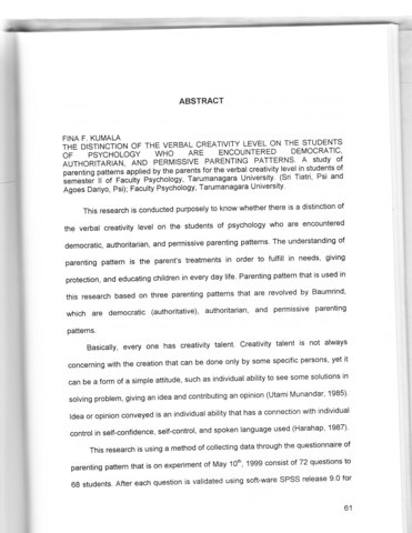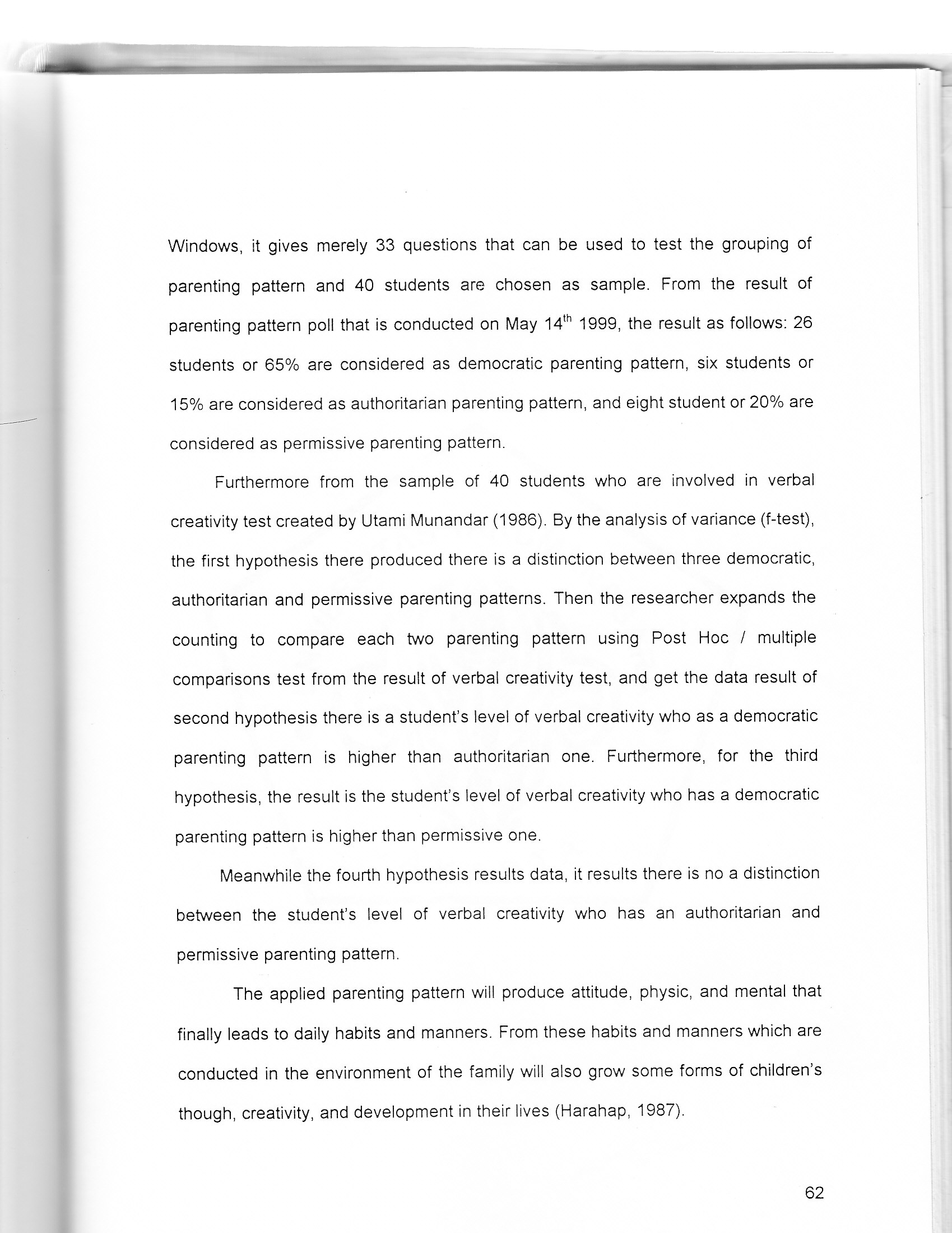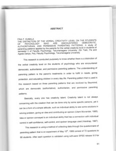 "This research is conducted purposely to know whether there is a distinction of the verbal creativity level on the students of psychology who are encountered democratic, authoritarian, and permissive parenting patterns. The understanding of parenting pattern is the parent’s treatments in order to fulfill in needs, giving protection, and educating children in every day life. Parenting pattern that is used in this research based on three parenting patterns that are revolved by Baumrind,