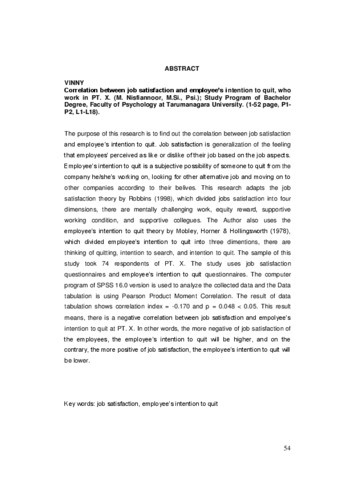 The purpose of this research is to find out the correlation between job satisfaction and employee’s intention to quit. Job satisfaction is generalization of the feeling that employees’ perceived as like or dislike of their job based on the job aspects. Employee’s intention to quit is a subjective possibility of someone to quit from the company he/she’s working on, looking for other alternative job and moving on to other companies according to their belives. This research adapts the job satisfaction theory by Robbins (1998), which divided jobs satisfaction into four dimensions, there are mentally challenging work, equity reward, supportive working condition, and supportive collegues. The Author also uses the employee’s intention to quit theory by Mobley, Horner & Hollingsworth (1978), which divided employee’s intention to quit into three dimentions, there are thinking of quitting, intention to search, and intention to quit. The sample of this study took 74 respondents of PT. X. The study uses job satisfaction questionnaires and employee’s intention to quit questionnaires. The computer program of SPSS 16.0 version is used to analyze the collected data and the Data tabulation is using Pearson Product Moment Correlation. The result of data tabulation shows correlation index = -0.170 and p = 0.048 < 0.05. This result means, there is a negative correlation between job satisfaction and empolyee’s intention to quit at PT. X. In other words, the more negative of job satisfaction of the employees, the employee’s intention to quit will be higher, and on the contrary, the more positive of job satisfaction, the employee’s intention to quit will be lower.