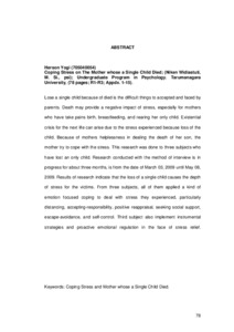 Lose a single child because of died is the difficult things to accepted and faced by parents. Death may provide a negative impact of stress, especially for mothers who have take pains birth, breastfeeding, and rearing her only child. Existential crisis for the next life can arise due to the stress experienced because loss of the child. Because of mothers helplessness in dealing the death of her son, the mother try to cope with the stress. This research was done to three subjects who have lost an only child. Research conducted with the method of interview is in progress for about three months, is from the date of March 03, 2009 until May 08, 2009. Results of research indicate that the loss of a single child causes the depth of stress for the victims. From three subjects, all of them applied a kind of emotion focused coping to deal with stress they experienced, particularly distancing, accepting-responsibility, positive reappraisal, seeking social support, escape-avoidance, and self-control. Third subject also implement instrumental strategies and proactive emotional regulation in the face of stress relief.