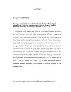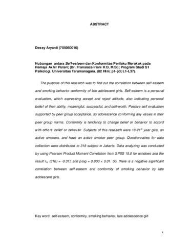 Aryanti, Dessy (2009) Hubungan Antara Self-Esteem Dan Konfromitas Perilaku Merokok Pada Remaja Akhir Puteri. Skripsi thesis, Universitas Tarumanagara.