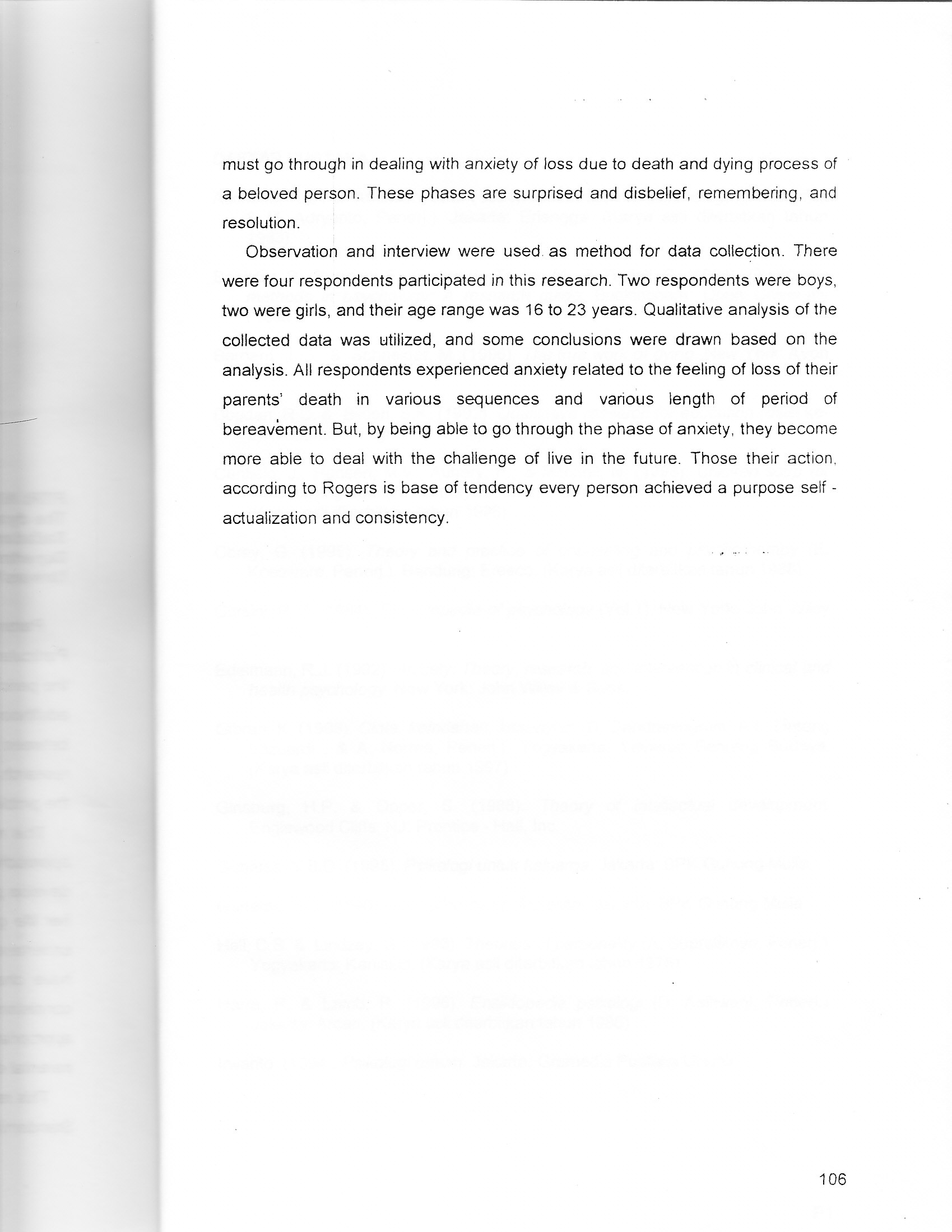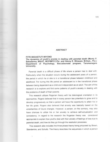 research is to explore and find some patterns of youth’s anxiety in dealing with the problems of death of their parents. This research utilizes Rogerian theory with his teleological orientation in its approaches. Rogers believed that in every person lies potentials to grow and to develop progressively so that a person will have the opportunity to attain his or her life goals. Rogers also believed that anxiety was basically based on the uncertainties of future changes. However, a person, on the contrary, may also have chances to utilize his or her anxiety to achieve self-actualization and consistency. in regard to his research the Rogerian theory was considered appropriate to explain how youths deal with their anxiety of feelings of loss due to parental death, and how do they go through the resolution processes. This research also includes the three-phase theory being proposed by Brown. Standemire, and Schultz. The theory describes the sequences in which a person must go through in dealing with anxiety of loss due to death and dying process of a beloved person. These phases are surprised and disbelief, remembering, and resolution. Observation and interview were used. as method for data collection. There were four respondents participated in this research. Two respondents were boys, two were girls, and their age range was 16 to 23 years. Qualitative analysis of the collected data was utilized, and some conclusions were drawn based on the analysis. All respondents experienced anxiety related to the feeling of loss of their parents"" death in various sequences and various length of period of bereavement. But, by being able to go through the phase of anxiety, they become more able to deal with the challenge of live in the future. Those their action, according to Rogers is base of tendency every person achieved a purpose self actualization and consistency.