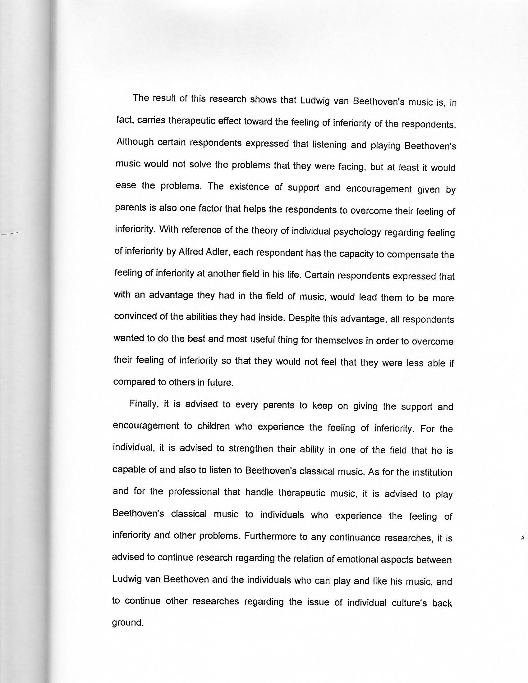 Finally, it is advised to every parents to keep on giving the support and encouragement to children who experience the feeling of inferiority. For the individual, it is advised to strengthen their ability in one of the field that he is capable of and also to listen to Beethoven's classical music. As for the institution and for the professional that handle therapeutic music, it is advised to play Beethoven's classical music to individuals who experience the feeling of inferiority and other problems. Furthermore to any continuance researches, it is advised to continue research regarding the relation of emotional aspects between Ludwig van Beethoven and the individuals who can play and like his music, and to continue other researches regarding the issue of individual culture's background."