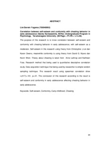 The purpose of this research is to know correlation between self-esteem and conformity with cheating behavior in early adolescence, with self-esteem as a moderator. Self-esteem in this research using theory from Christopher J.ruk dan Karen Owens, meanwhile conformity is using theory from David G. Myers dan Kevin Wren. Theory about cheating is taken from Anne Lathrop and Kathleen Foss. Research method that being used is quantitative descriptive correlation study. Data acquisition technique that being used by researcher is simple random sampling technique. The research result using spearman correlation show rs(417)=.161, p<.01. The conclusion of this research according to the result is self-esteem and conformity in early adolescence affecting cheating behavior in early adolescence.