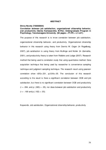 The purpose of this research is to know correlation between job satisfaction, organizational citizenship behavior, and productivity. Organizational citizenship behavior in this research using theory from Dennis W. Organ (In Rogelberg, 2007), job satisfaction is using theory from Mullinge and Muller (In Zamralita, 2001), and productivity theory is taken from Robbins and Judge (2007). Research method that being used is correlation study that using quantitative method. Data acquisition technique that being used by researcher is convenience sampling technique and judgment sampling technique. The research result using pearson correlation show r(95)=.231, p(.024)<.05. The conclusion of this research according to the result is there a significant correlation between OCB and job satisfaction, but there is no significant correlation between OCB and productivity (r = .094, and p (.365) > .05), nor does between job satisfaction and productivity (r = -.169 and p (.102) > .05).