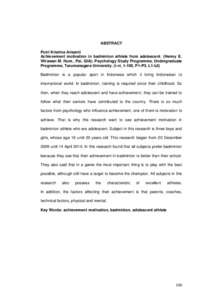 Badminton is a popular sport in Indonesia which it bring Indonesian to international world. In badminton, training is requited since their childhood. So then, when they reach adolescent and have achievement, they can be trained to follow what their seniors have contributed to the country. There is so much factors from psychology who influence achievement, one of them is motivation to achieve. That is why this research want to see achievement motivation in badminton athlete who are adolescent. Subject in this research is three boys and girls, whose age 16 until 20 years old. This research began from 20 December 2009 until 14 April 2010. In this research found that all subjects prefer badminton because they see that their achievement in badminton is better than their school. They also said that in a game the most important thing is to play with the best possible, although still have a target to become the champion. All subjects in this research also possess the characteristic of excellent athletes. In addition, the factors affecting their achievement is that parents, coaches, technical factors, physical and mental.