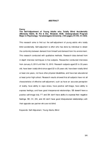 Fenny, F (2010) Gambaran Penyesuaian Diri Dewasa Awal Penyandang Tuna Netra Total Secara Mendadak. Skripsi thesis, Universitas Tarumanagara.