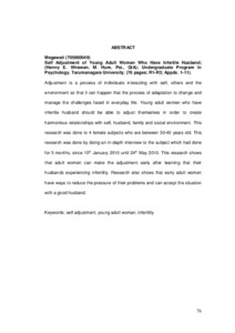 Penyesuaian diri adalah suatu proses individu melakukan interaksi dengan diri sendiri, orang lain, dan lingkungan sehingga dapat terjadi proses adaptasi terhadap perubahan yang dialami dan mengatur tantangan dalam kehidupan sehari-hari. Perempuan dewasa awal yang memiliki suami infertil harus dapat melakukan penyesuaian diri supaya dapat menciptakan hubungan yang harmonis dengan diri sendiri, suami, keluarga, dan lingkungan. Penelitian ini dilakukan terhadap 4 subyek perempuan dewasa awal berusia 30-40 tahun. Penelitian ini dilakukan dengan metode wawancara mendalam kepada subyek dalam rentang waktu 5 bulan, yaitu dari tanggal 15 Januari 2010 hingga tanggal 24 Mei 2010. Penelitian ini menunjukkan bahwa perempuan dewasa awal dapat melakukan penyesuaian diri setelah mengetahui bahwa suami mereka mengalami infertilitas. Penelitian juga menunjukkan bahwa perempuan dewasa awal memiliki cara-cara untuk mengurangi tekanan akibat masalah yang dihadapi dan dapat menerima keadaan suaminya dengan baik.