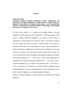 Azalia, Azalia (2014) Hubungan Antara Kecerdasan Emosional Perilaku Delinkuensi, dan Prestasi Belajar Pada Remaja Madya di SLTA Jakarta (Studi Pada Siswa/I di SMA X, SMA Y, dan SMK Z). Skripsi thesis, Universitas Tarumanagara.