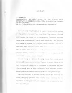Decision making is a process od making choices from among several alternatives for making problem solution. Effectively of decision making can be reach from minimal mistakes that in the process. In this process has many influential things, such as strees, therefore the study examined coreelation between grade jof job sress with effectively of decision making from manager