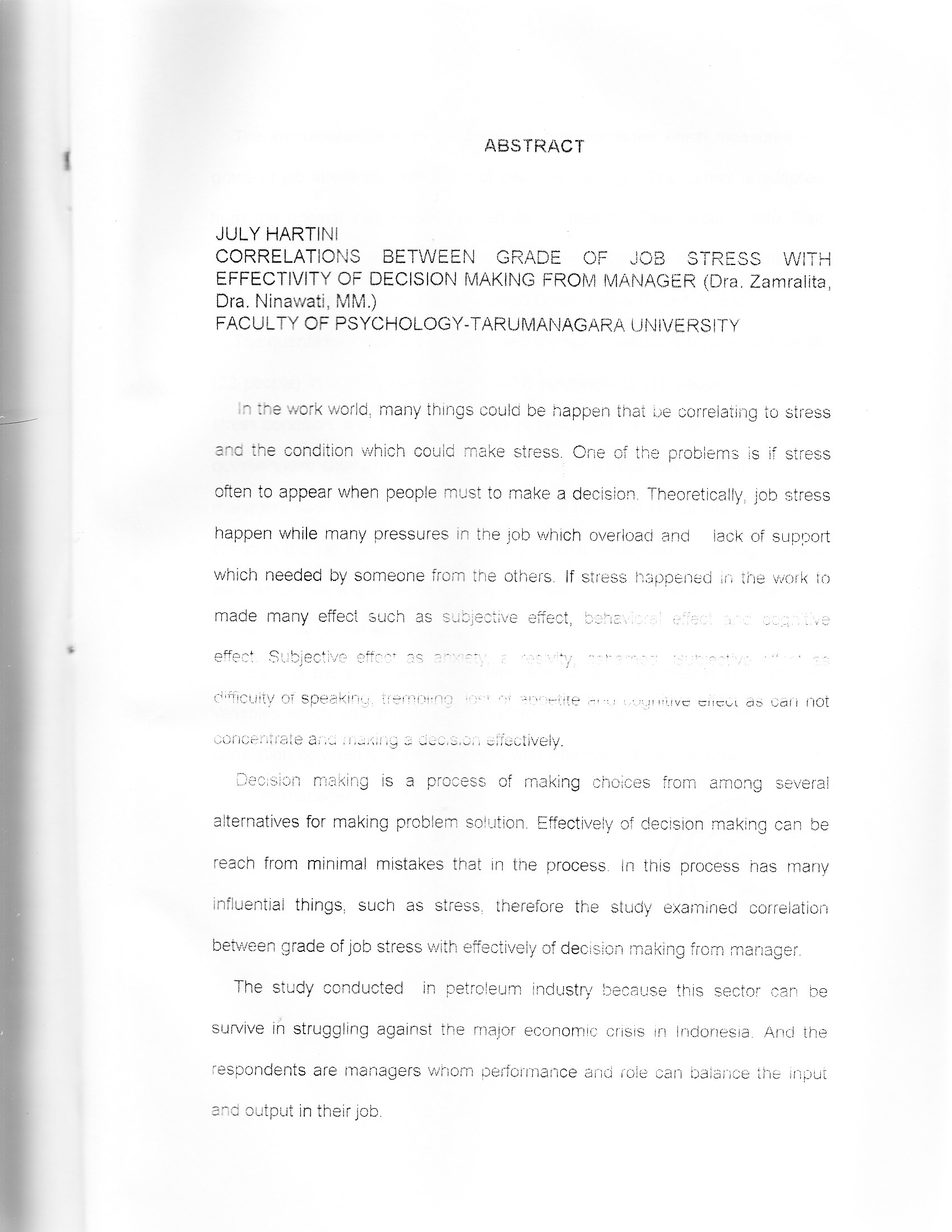 HARTINI, ST., JULY (2000) Hubungan tingkat stress kerja dengan efektivitas pengambilan keputusan pada manajer. Skripsi thesis, Universitas Tarumanagara.