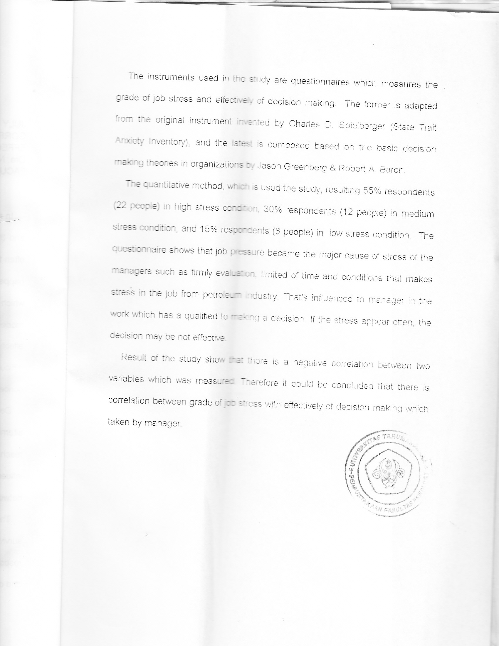 The instruments used in the study are wuestionnaires which measures the grade of job stress and efectively of decision making. The former is adapted from the original instrument invented by Charles D Spielberger (state trait anxiety inventory), and the latest is composed based on the basic decision making theories in organizarions by Jason Greenberg & Robert A Baron