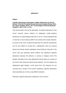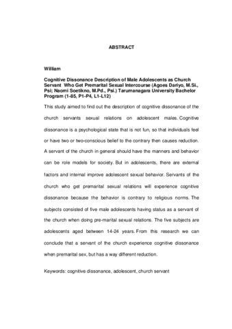 William, William (2010) Gambaran Disonansi Kognitif Remaja Pria Pelayan Gereja Yang Melakukan Hubungan Seksual Pranikah. Skripsi thesis, Universitas Tarumanagara.