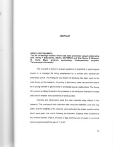 "This research is trying to answer questions of what kind of psychological impact in a marriage life being experienced by a woman who experienced premarital sexual. The triangular love theory of Stenberg has been used as the main theory on this research. According to this theory, loves becomes the reason for a young woman to get involved in premarital sexual relationships. The theory of Levinson is utilized to explore the problems in the family and Rapoport concep was used to explore some problems of family conflict.