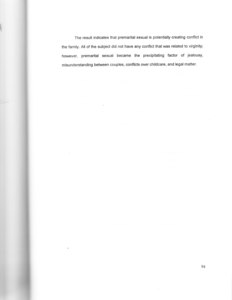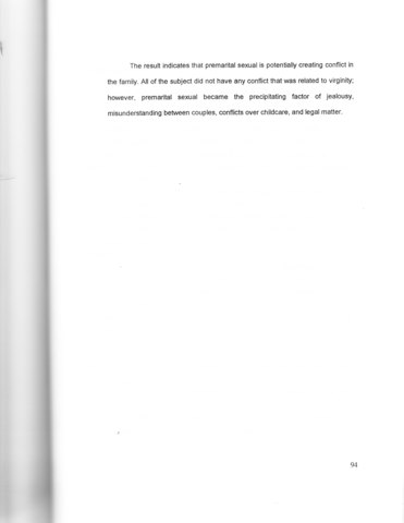 Interview and observation were the main methods being utilized in this research. The process of data collection was conducted between June and July 2000, and the reliability of the answers were rechecked by closed questionnaires which were given one month following the interview. Subjects were consisted of four married women of 20 to 34 years of age and they were involved in premarital sex’ual experienced at the age of 17 to 27. The result indicates that premarital sexual is potentially creating conflict in the family. All of the subject did not have any conflict that was related to virginity; however, premarital sexual became the precipitating factor of jealousy, misunderstanding between couples, conflicts over childcare, and legal matter."