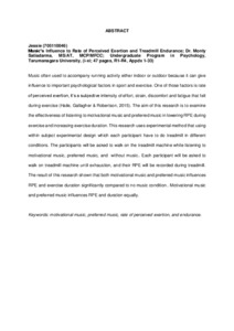 Music often used to accompany running activity either indoor or outdoor because it can give influence to important psychological factors in sport and exercise. One of those factors is rate of perceived exertion, it’s a subjective intensity of effort, strain, discomfort and fatigue that felt during exercise (Haile, Gallagher & Robertson, 2015). The aim of this research is to examine the effectiveness of listening to motivational music and preferred music in lowering RPE during exercise and increasing exercise duration. This research uses experimental method that using within subject experimental design which each participant have to do treadmill in different conditions. The participants will be asked to walk on the treadmill machine while listening to motivational music, preferred music, and without music.. Each participant will be asked to walk on treadmill machine until exhaustion, and their RPE will be recorded during treadmill. The result of this research shown that both motivational music and preferred music influences RPE and exercise duration significantly compared to no music condition.. Motivational music and preferred music influences RPE and duration equally