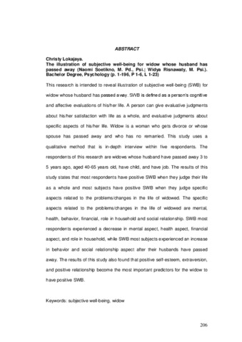 Penelitian ini ditujukan untuk mengetahui gambaran subjective well-being (SWB) pada janda yang suaminya meninggal. SWB adalah evaluasi kognitif dan afektif seseorang akan kehidupannya. Evaluasi SWB dapat dilakukan pada kehidupan seseorang secara keseluruhan dan pada aspek-aspek spesifik dalam kehidupannya. Janda adalah wanita yang telah menikah namun mengalami perceraian, baik perceraian hidup ataupun mati. Penelitian ini menggunakan metode kualititatif, melalui in-depth interview dengan 5 orang subyek. Subyek adalah janda yang suaminya meninggal 3-5 tahun yang lalu, berusia 40-65 tahun, memiliki anak, dan bekerja. Hasil penelitian menyatakan bahwa sebagian besar janda memiliki SWB yang positif baik saat melakukan evaluasi secara keseluruhan dalam kehidupannya dan saat melakukan evaluasi pada keenam aspek yang berhubungan dengan kehidupan menjanda. Keenam aspek spesifik dalam kehidupan menjanda adalah aspek mental, kesehatan, perilaku, keuangan, peran dalam rumah tangga, dan hubungan sosial. Sebagian besar subyek mengalami penurunan SWB dalam bidang mental, kesehatan, keuangan, dan peran dalam rumah tangga, namun sebagian besar subyek justru mengalami peningkatan SWB dalam bidang perilaku dan hubungan sosial setelah suaminya meninggal. Hasil penelitian juga menemukan bahwa harga diri yang positif, extraversion, dan positive relationship menjadi prediktor terpenting bagi janda agar dapat memiliki SWB yang positif.