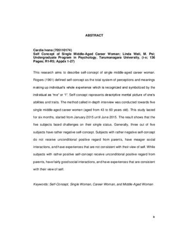 This research aims to describe self-concept of single middle-aged career woman. Rogers (1961) defined self-concept as the total system of perceptions and meanings making up individual’s whole experience which is recognized and symbolized by the individual as “me” or “I”. Self-concept represents descriptive mental picture of one’s abilities and traits. The method called in-depth interview was conducted towards five single middle-aged career women (aged from 43 to 60 years old). This study lasted for six months, started from January 2015 until June 2015. The result shows that the five subjects faced challenges on their single status. Generally, three out of five subjects have rather negative self-concept. Subjects with rather negative self-concept do not receive unconditional positive regard from parents, have meager social interactions, and have experiences that are not consistent with their view of self. While subjects with rather positive self-concept receive unconditional positive regard from parents, have fairly good social interactions, and have experiences that are consistent with their view of self
