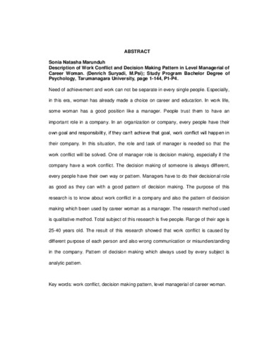 Marunduh, Sonia Natasha (2010) Gambaran Konflik Kerja Dan Pola Decision Making Pada Wanita Karir Tingkat Manajerial. Skripsi thesis, Universitas Tarumanagara.