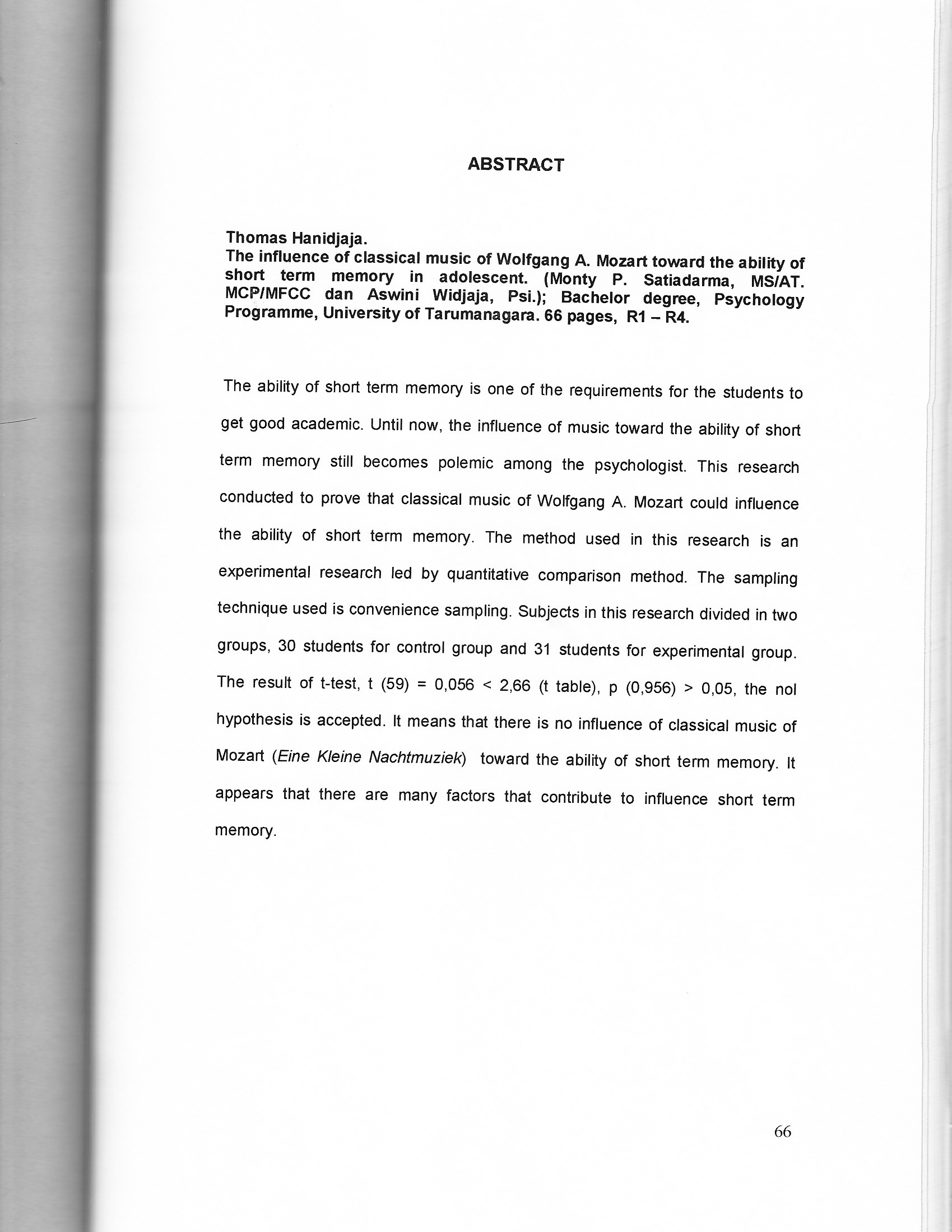 "The ability of short term memory is one of the requirements for the students to get good academic. Until now, the influence of music toward the ability of short term memory still becomes polemic among the psychologist. This research conducted to prove that classical music of Wolfgang A. Mozart could influence the ability of short term memory. The method used in this research is an experimental research led by quantitative comparison method. The sampling technique used is convenience sampling. Subjects in this research divided in two groups, 30 students for control group and 31 students for experimental group. 3 The result of t-test, t (59) = 0,056 < 2,66 (t table), p (0,956) > 0,05, the nol hypothesis is accepted. It means that there is no influence of classical music of Mozart (Eine Kleine Nachtmuziek) toward the ability of short term memory. It appears that there are many factors that contribute to influence short term memory.