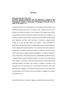 Joining big motorcycle club or biker gang is one of the popular activities among young adulthood. Because other than the fun activities, riding a big bike has some sort of prestige and can boost self-esteem. In the completion of this research, this research was observed the relationship between self-esteem and motivation to engage on the members of the big motorcycle club by using the theory of self-esteem that was brought up by Heatherton and Polivy (1991) and theory of motivation to engage that was brought up by Deci and Ryan (2000). This research is using quantitative non experimental method with techniques of sample taking being are: purposive sampling, criterion sampling and snowball sampling. For the measuring instruments used are two questionnaire, self-esteem questionnaire based on Heatherton and Polivy theory (1991) and motivation to engage questionnaire adapted from Tumblin (2012) based on Decy and Ryan theory. Sample taking was done in Jabodetabek area between August - October 2015 by involving 175 subjects aging 20 - 40 years old. From data analysis result, yielding r = 0,218 and p = 0.004 which means that there is a positive significance relationship between self-esteem and motivation to engage on members of big motorcycle club. This result shows that if the self-esteem is high, then there is also high motivation to engage on the members of big motorcycle club. And contrary wise, if the self-esteem is low, then there is also a low motivation to engage on the members of big motorcycle club