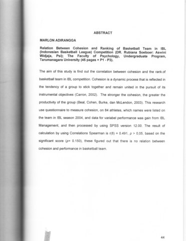The aim of this study is find out the correlation between cohesion and the rank.of basketball team in IBL competition. Cohesion is a dynamic process that is reflected in the tendency of a group to stick together and remain united in the pursuit of its instrumental objectives (Carron, 2002). The stronger the cohesion, the greater the productivity of the group (Beal, Cohen, Burke, dan McLendon, 2003). This research use questionnaire to measure cohesion, on 84 athletes, which names were listed on the team in IBL season 2004, and data for variabel performance was gain from IBL Management, and then processed by using SPSS version 12.00. The result of calculation by using Correlations Spearman is r(8) = 0.491, p > 0,05, based on the significant score (p= 0.150), these ngured out that there is no relation between cohesion and performance in basketball team.
