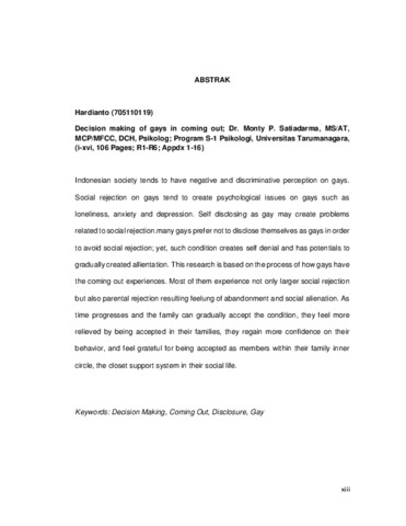 Hardianto, Hardianto (2015) Gambaran pengambilan keputusan pada gay yang telah melakukan coming out. Skripsi thesis, Universitas Tarumanagara.