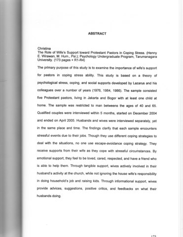 The primary purpose of this study is to examine the importance of wife's support for pastors in coping stress ability. This study is based on a theory of psychological stress, coping, and social supports developed by Lazarus and his colleagues over a number of years (1976, 1984, 1986). The sample consisted five Protestant pastors, living in Jakarta and Bogor with at least one child at home. The sample was restricted to man betweens the ages of 40 and 65. Qualified couples were interviewed within 5 months, started on December 2004 and ended on April 2005. Husbands and wives were interviewed separately, yet in the same place and time. The findings clarify that each sample encounters stressful events due to their jobs. Though they use different coping strategies to deal with the situations, no one use escape-avoidance coping strategy. They receive supports from their wife as they cope with stressful circumstances. By emotional support, they feel to be loved, cared, respected, and have a friend who is able to help them. Through tangible support, wives actively involved in their husband's activity at the church, while not ignoring the house wife's responsibility in doing household's job and raising kids. Through informational support, wives provide advices, suggestions, positive critics, and feedbacks on what their husbands doing.