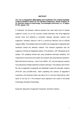 In Indonesia, the domestic violence research has never been found in football supporter context, but at the countries outside Indonesia, that thing happened several times and obtained a correlation between domestic violence and supporters. Domestic violence it self is a continuous behavior and an inflicted negative effect. This research aims to know the role of supporter’s masculinity and fanaticism toward the domestic violence. The research population was the supporter of Persatuan Sepakbola Jakarta, The Jakmania, with 196 people as the sample. The sampling method was using accidental technique sampling. The measurement instruments that usedin this research was using Wolman fanaticism, Male Role Norms Inventory – Short Form (MRNI - SF), and the domestic violence has analyzed by multiple regression analysis technique. The analysis result shown the rule of supporter’s masculinity and fanaticism toward the domestic violance (R2=0.541 and p=0.000<0.05), which explaining the number of supporter’s masculinity and fanaticism effect was about 54.1% and has influenced by other factor for the rest of it. This research result expected to be useful in the Social Psychology and Sports Psychology