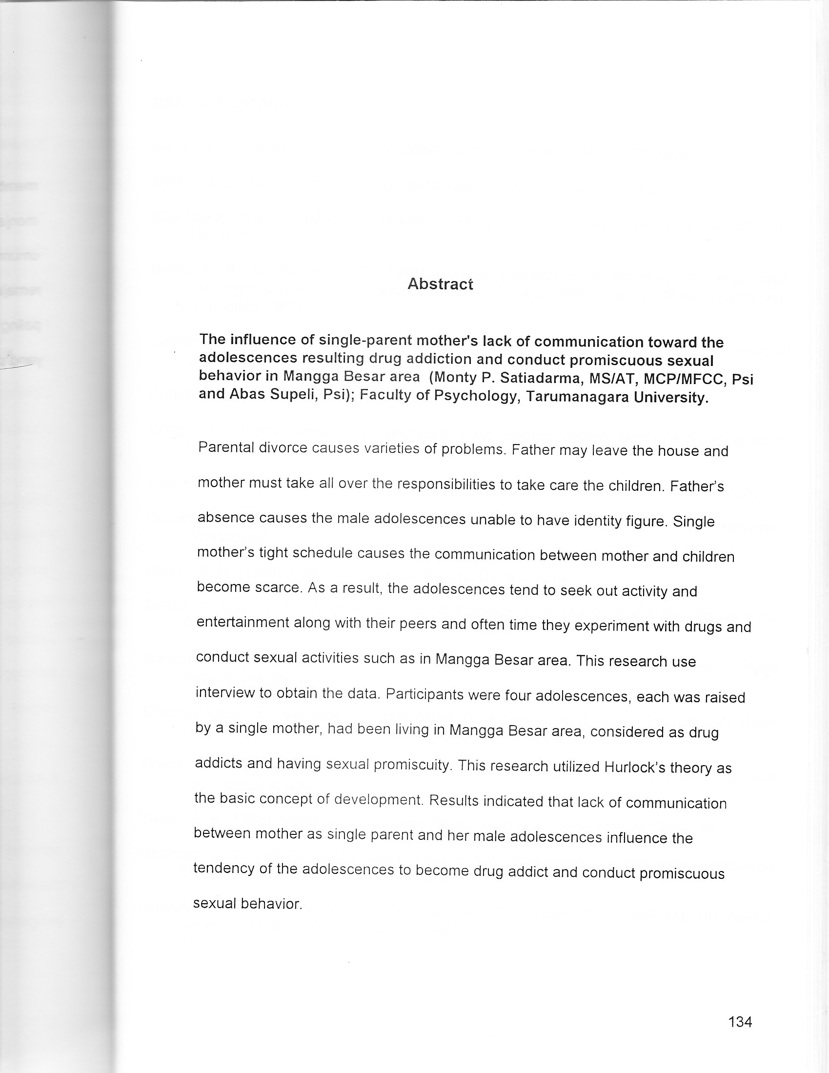 "Parental divorce causes varieties of problems. Father may leave the house and mother must take all over the responsibilities to take care the children. Fatherts absence causes the male adolescences unable to have identity figure. Single mother's tight schedule causes the communication between mother and children become scarce. As a result, the adolescences tend to seek out activity and entertainment along with their peers and often time they experiment with drugs and conduct sexual activities such as in Mangga Besar area. This research use interview to obtain the data. Participants were four adolescences, each was raised by a single mother, had been living in Mangga Besar area, considered as drug addicts and having sexual promiscuity. This research utilized Hurlock's theory as the basic concept of development. Results indicated that lack of communication between mother as single parent and her male adolescences influence the tendency of the adolescences to become drug addict and conduct promiscuous