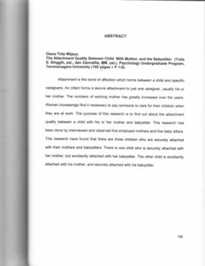 Attachment is the bond of affection which forms between a child and specific caregivers. An infant forms a secure attachment to just one caregiver, usually his or her mother. The numbers of working mother has greatly increased over the years. Women increasingly find it necessary to pay someone to care for their children when they are at work. The purpose of this research is to find out about the attachment quality between a child with his or her mother and 'babysitter. This research had been clone by interviewed and observed five employed mothers and five baby sitters. This research have found that there are three children who are securely attached with their mothers and babysitters. There is one child who is securely attached with her “mother, but avoidantiy attached with her babysitter. The other child is avoidantly attached with his mother, and securely attached with his babysitter.