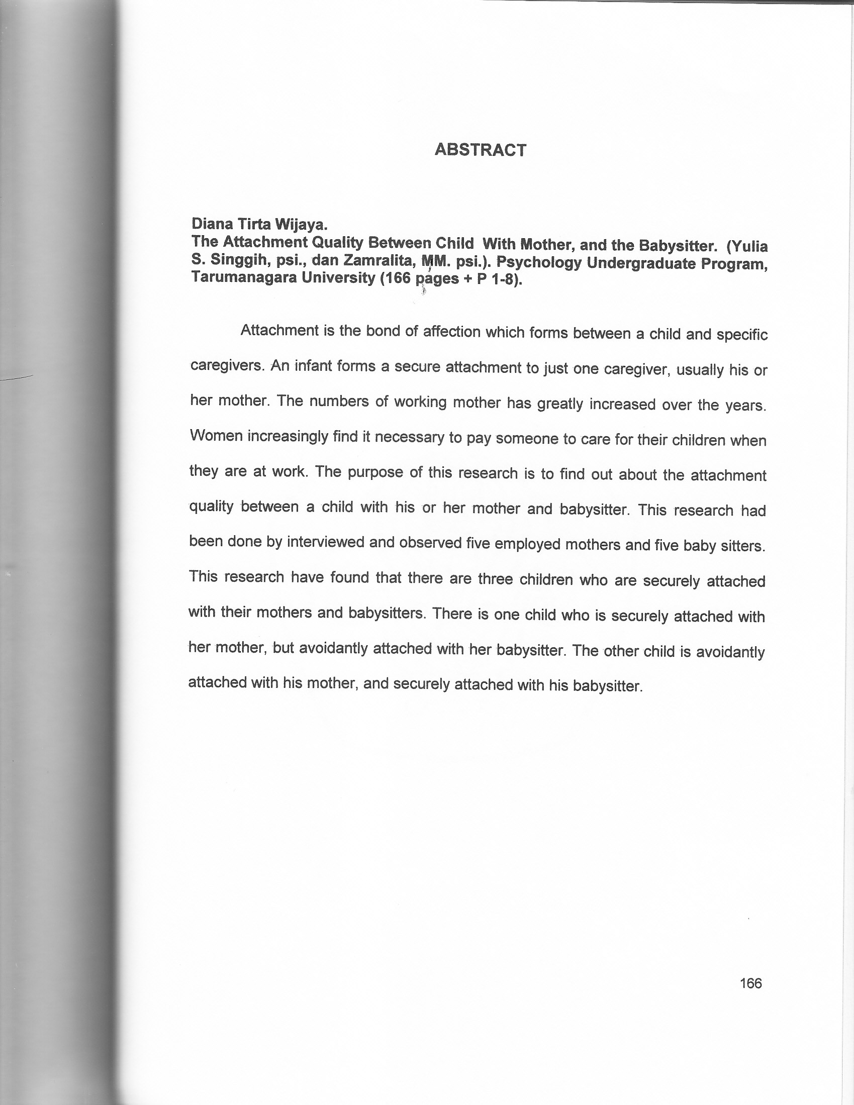 W., Diana Tirta (2005) Gambaran kualitas keterikatan antara anak dengan ibu, dan pengasuhnya. Skripsi thesis, universitas Tarumanagara.